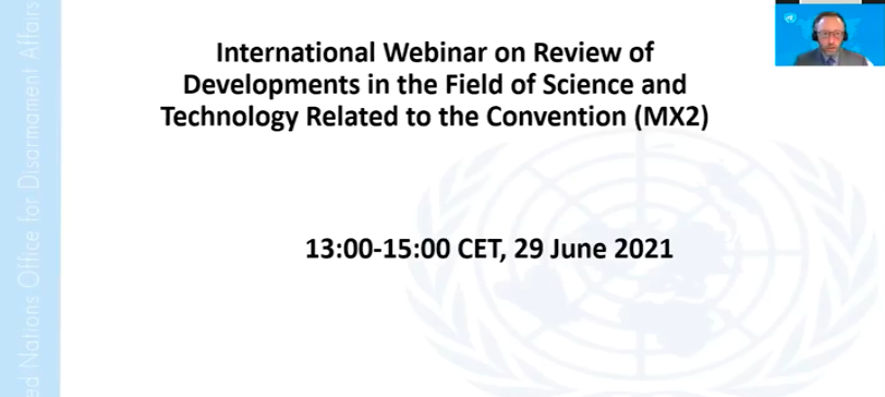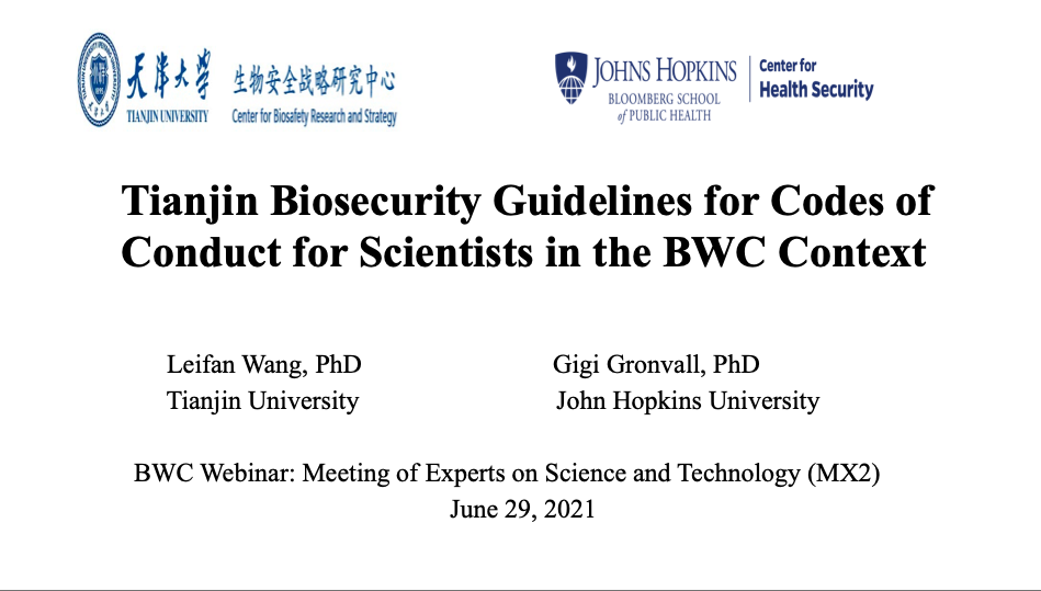 瑞士日内瓦时间2021年6月29日下午1点(北京时间2021年6月29日晚7点),联合国裁军事务办公室通过网络视频召开2021年《禁止生物武器公约》科学与技术发展专家组会议(MX2)。生物安全战略研究中心研究员、天津大学法学院副教授王蕾凡博士代表天津大学做专题发言,就《科学家生物安全行为准则天津指南》的发展背景和具体内容,以及天津大学联合美国约翰斯·霍普金斯大学、国际科学院组织(IAP)在《科学家生物安全行为准则天津指南》的制定与推广方面所做的努力进行了介绍。