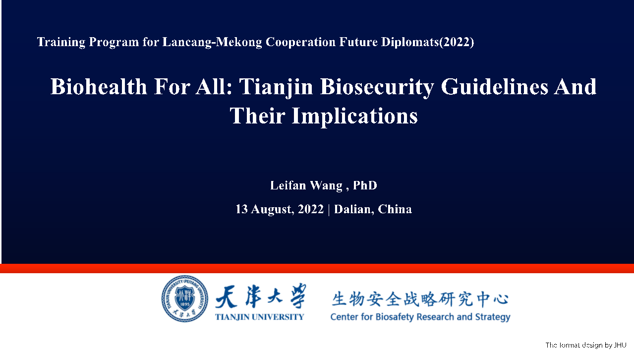 2022年8月13-16日,北京协和医学院全球健康中心在大连举办“澜湄未来外交官培育计划:以人为本的公共卫生合作”研修班。天津大学生物安全战略研究中心王蕾凡研究员受邀向研修班学员们讲授《天津指南》对公共卫生治理的启示,包括其宗旨、制定过程、具体内容,并结合具体案例组织大家讨论《天津指南》的适用问题。