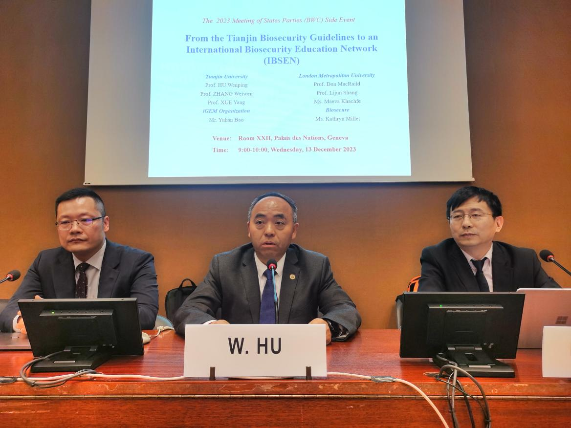 (通讯员 宋洁)12月13日上午,天津大学与英国伦敦城市大学在日内瓦万国宫共同主办“从《科学家生物安全行为准则天津指南》到‘国际生物安全教育网络(IBSEN)’”联合国边会,推介由主办方牵头完成的首本国际生物安全教材——《Essentials of Biological Security》,凝聚国际科学家力量,发展基于《科学家生物安全天津指南》(以下简称《天津指南》)的生物安全国际教育网络。