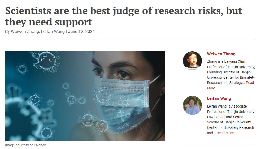 2024年6月12日,生物安全战略研究中心主任张卫文讲席教授与天津大学法学院、生物安全战略研究中心王蕾凡副教授在《原子能科学家公报》(Bulletin of the Atomic Scientists)官方网站共同发表题为“科学家是研究风险的最佳判断者,但他们需要支持”的署名文章。
