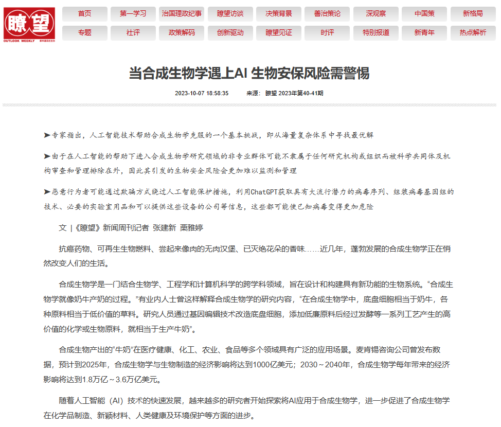 然而,人工智能与合成生物的深入融合也在一定程度上带来了更多风险。在接受《瞭望》新闻周刊记者采访时,天津大学生物安全战略研究中心副教授王方忠表示,人工智能可能诱发更多生物安保风险,如加大生物安全风险概率、提升生物安全风险危害程度等。