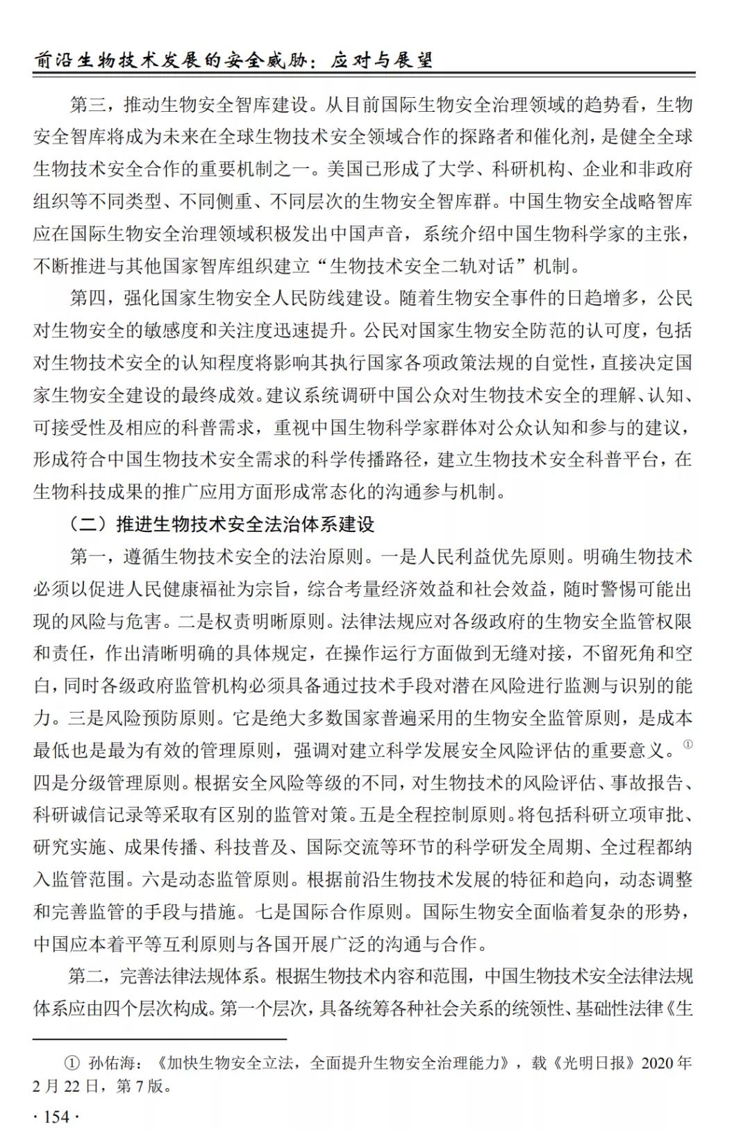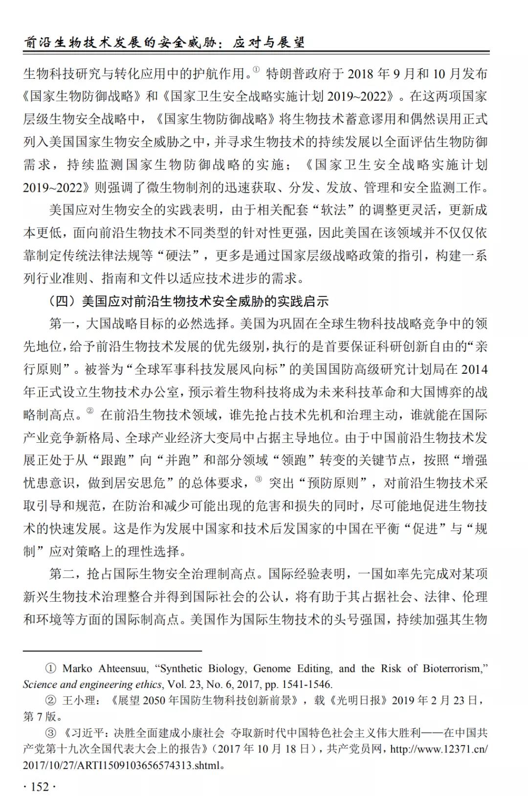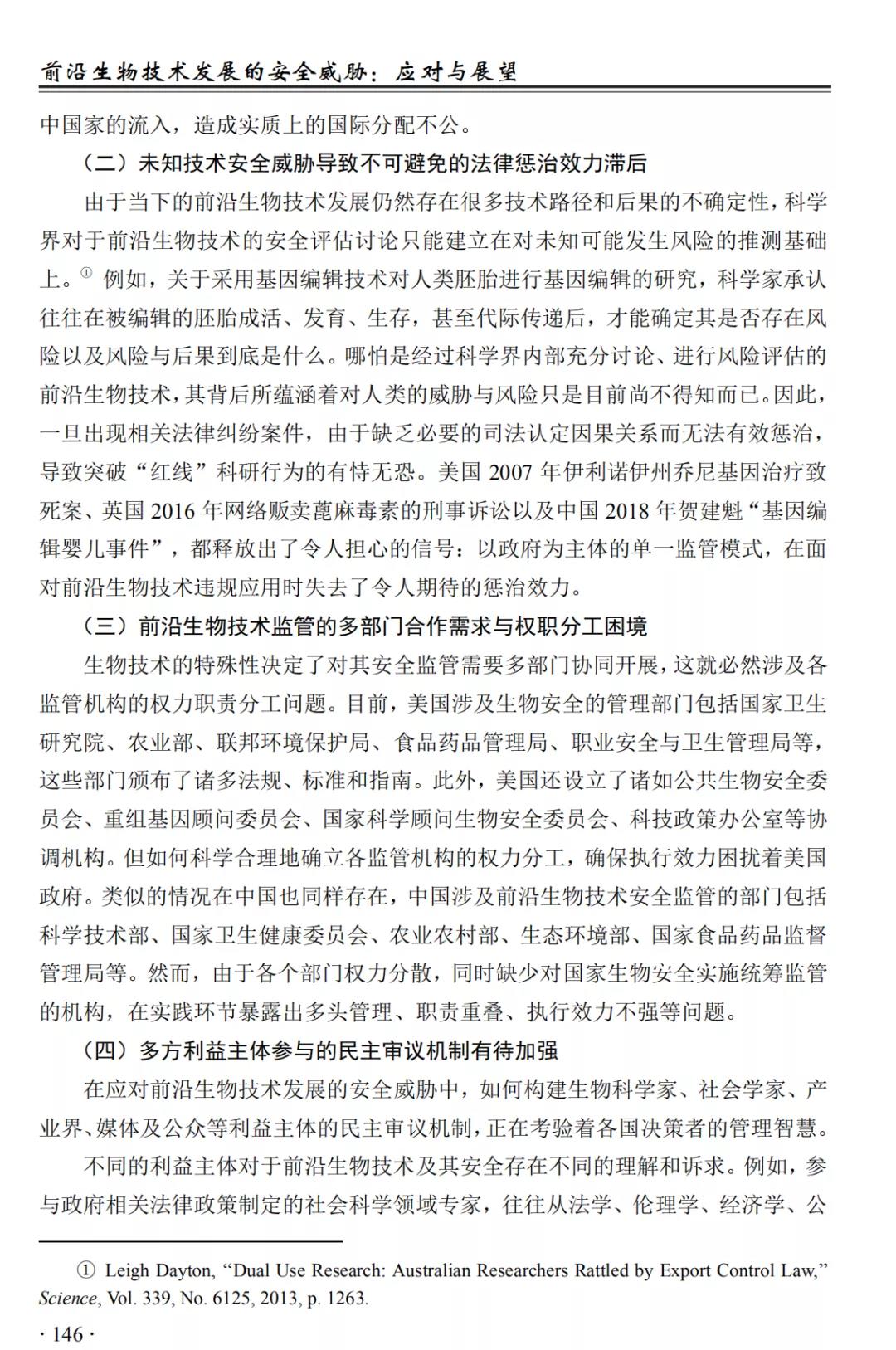 以基因编辑、基因驱动、合成生物学为代表的前沿生物技术正处于日新月异的飞速发展中,在医疗、农业等诸多领域为人类发展带来福祉的同时,也对国家乃至全人类的生物安全构成了严重威胁。在此背景下,世界大国在应对前沿生物技术安全威胁的几个共性问题值得重点关注:一是技术发展与技术安全的双重目标难以统筹;二是未知技术安全威胁导致不可避免的法律惩治效力滞后;三是监管的多部门合作需求与权职分工困境;四是多方利益主体参与的民主审议机制有待加强。由于中国前沿生物技术发展正处于从“跟跑”向“并跑”和部分领域“领跑”转变的关键节点,及时调整“促进”与“规制”前沿生物技术的应对措施已刻不容缓。前沿生物技术安全威胁的应对必须走到科技的前面去,对安全主体的规制更应走到科学的内部去。唯有在即将出台的国家《生物安全法》引领下全面推进生物技术安全的体制机制建设,逐步完善生物技术安全的法治体系建构,在政府主导下鼓励各利益相关方积极参与其中,才能确保前沿生物技术更好地造福于人民。