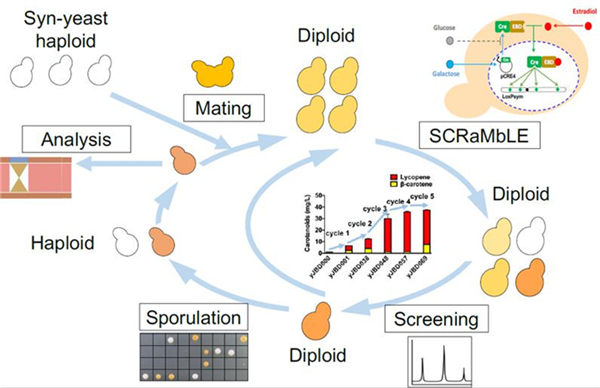 据了解,作为实验对象的酿酒酵母,分为人工合成基因组的合成型酵母和未经基因组合成的野生型酵母。酵母细胞的生活周期中依据染色体数量不同分为单倍体和二倍体两种状态,可以在不同阶段发生有丝分裂和减数分裂。